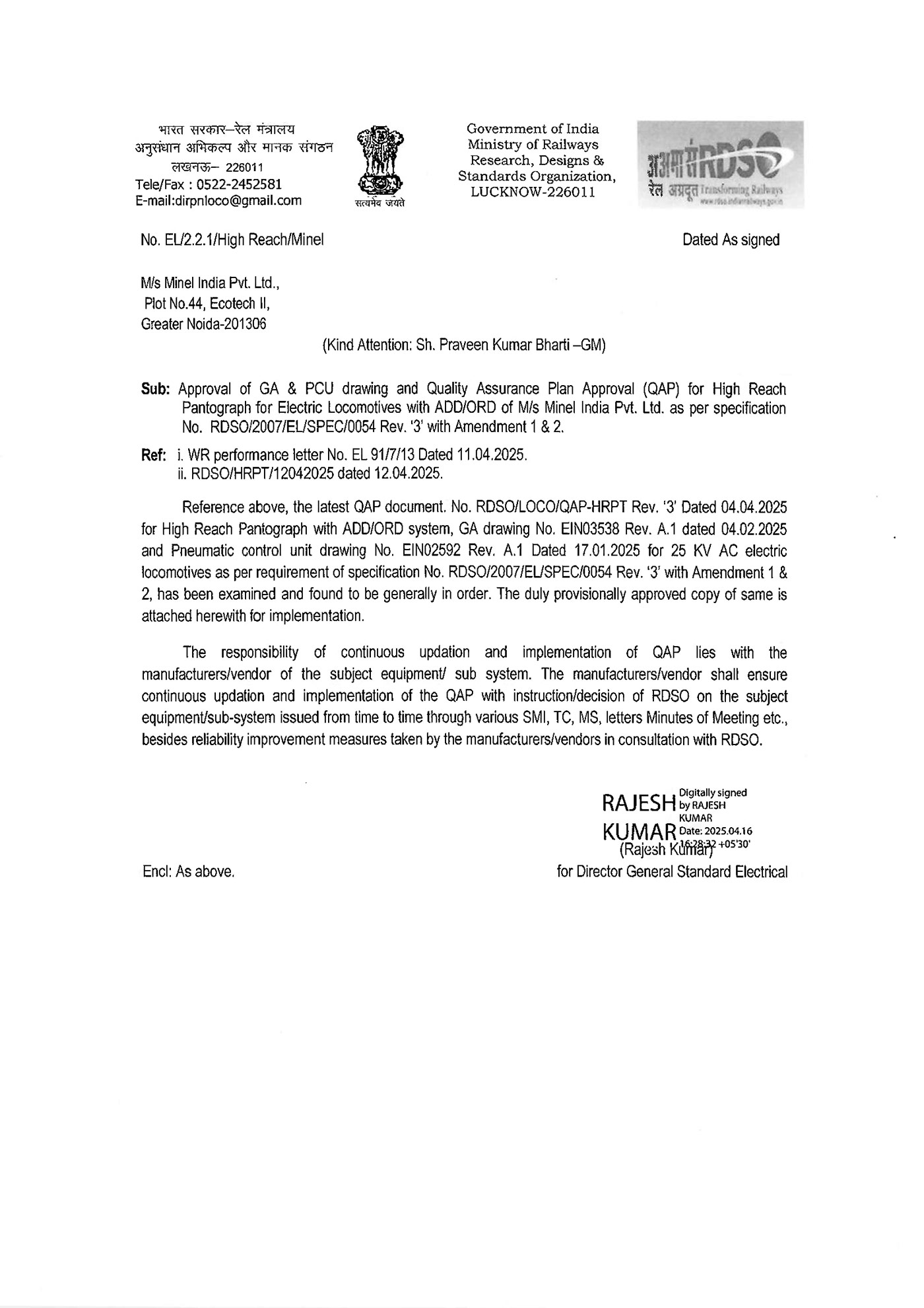 High-reach pantograph – RDSO certified (Research Design and Standard Organization)
